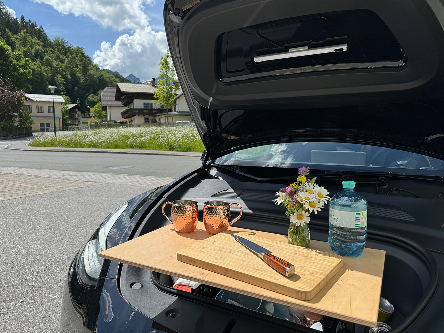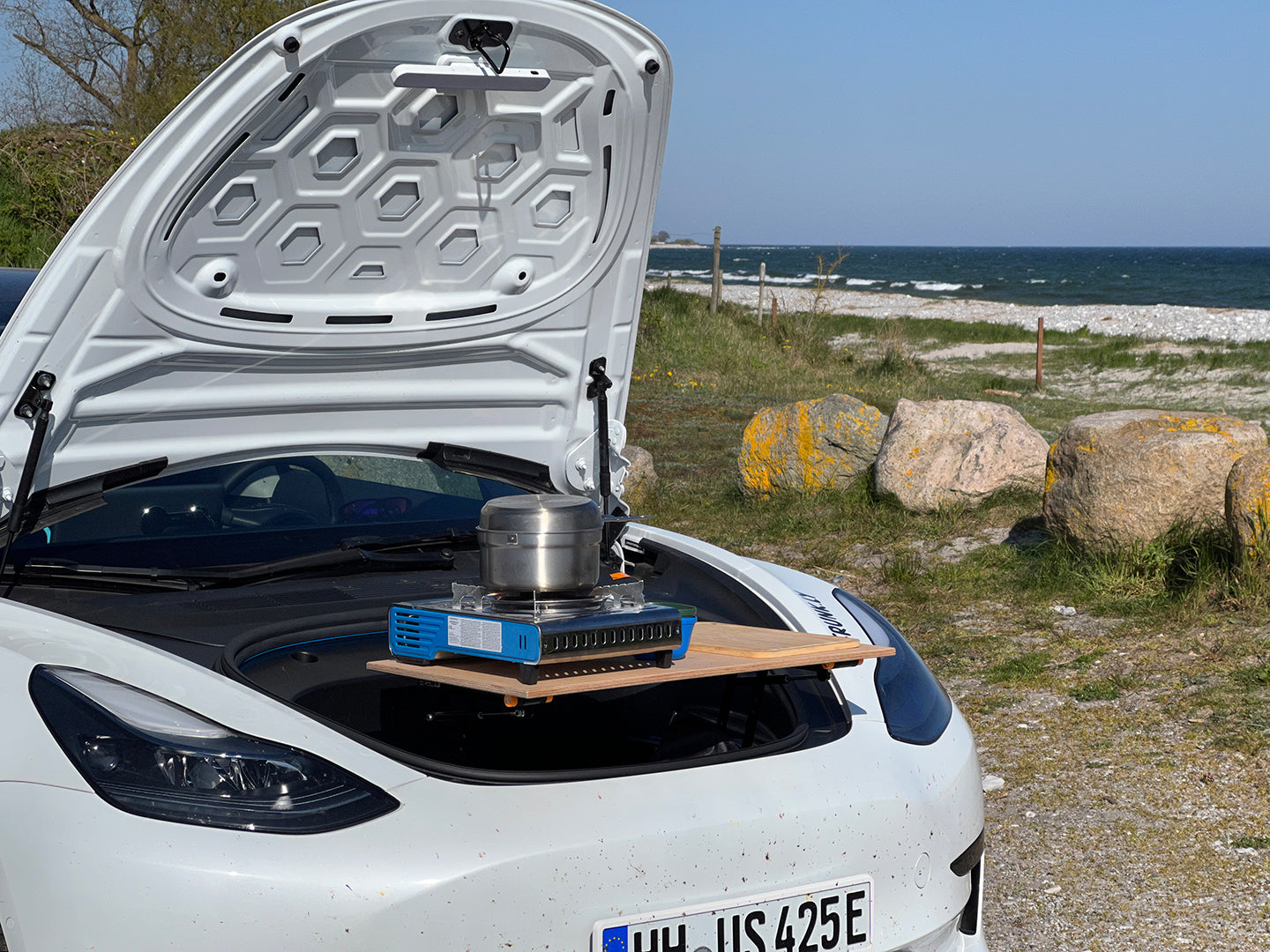 Thanks to its quick set-up, it's great for short stops at the Supercharger. The perfect companion for your road trip, camping trip or as a universal work surface in everyday life.
