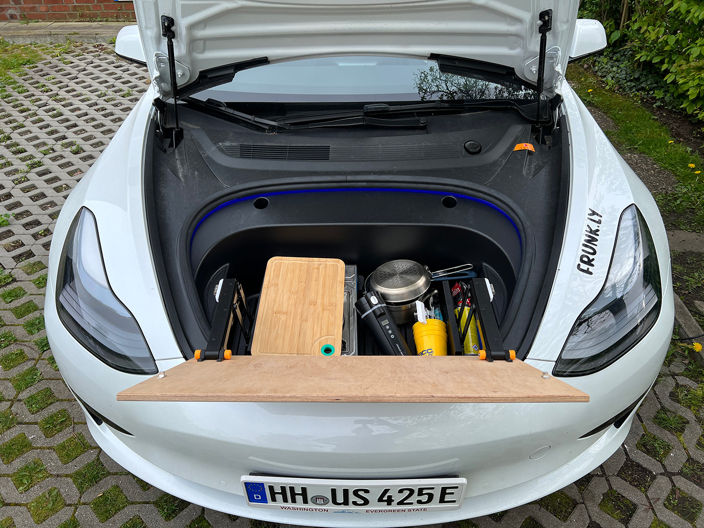 The Frunkly LT is the second generation of the popular Frunk Table, designed for quick and easy setup inside the frunk of your Tesla Model 3 or Model Y. The tabletop measures 27.56" long by 15.75" wide, offering enough space for a camping stove and cutting board, or a laptop with documents. The table supports up to 22 lb of weight.